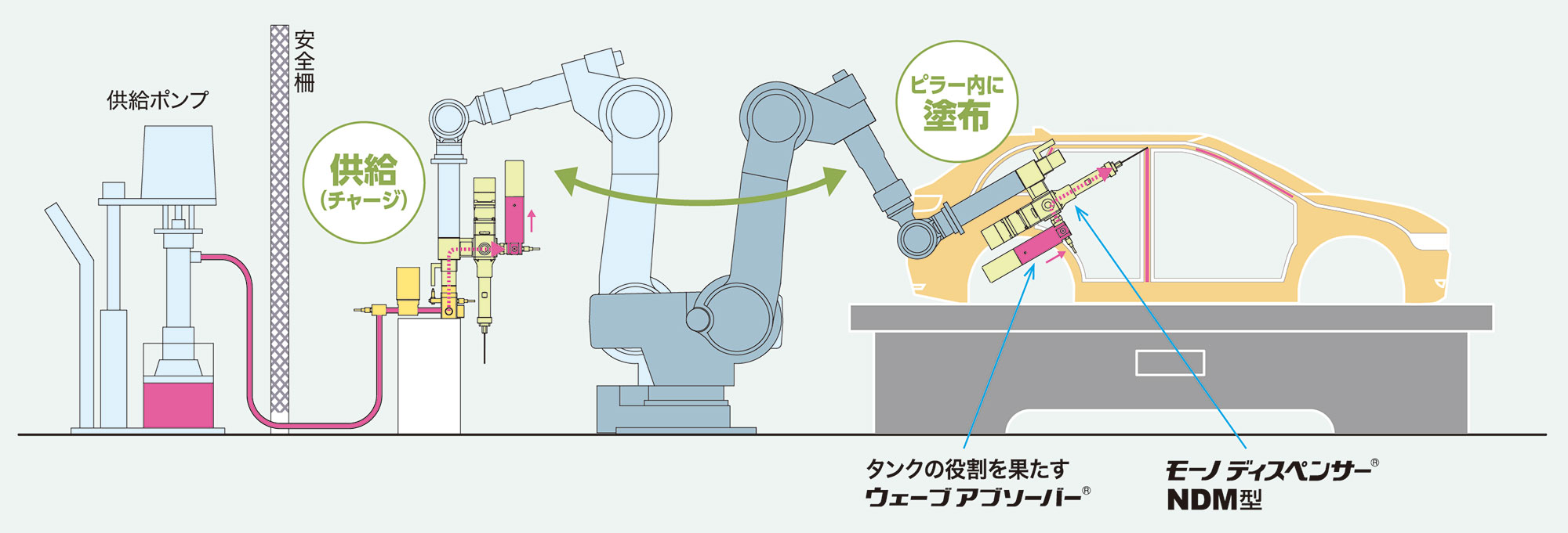 - ロボット可動部にホースのない環境で塗布できるシステムなので、車体の奥まった部分にも自在に塗布することができた。