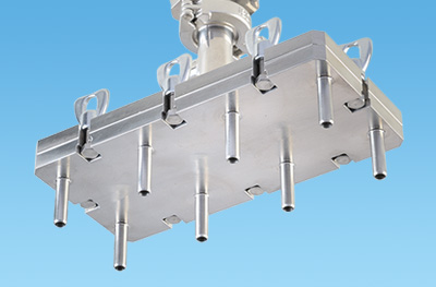 Combining with a Mohno Dispenser, this dispensing head can simultaneously dispense fluids to multiple spots.